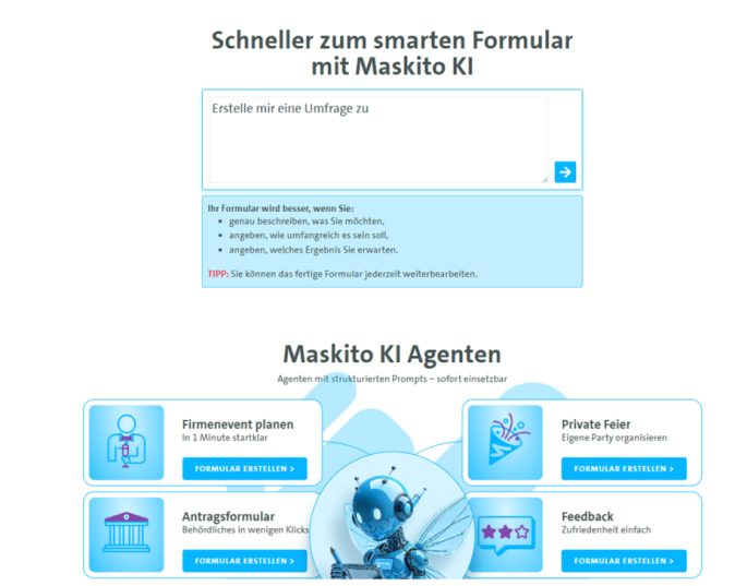Formulare sind heute ein fester Bestandteil vieler Arbeitsprozesse – egal ob im Unternehmen, in der Forschung oder im Bildungsbereich. Gleichzeitig kosten sie oft viel Zeit: beim Erstellen, beim Anpassen und vor allem bei der Auswertung. Maskito möchte genau an dieser Stelle helfen: als KI-gestützter Formulargenerator, der Sie bei der Erstellung, Durchführung und Auswertung von Umfragen und Formularen unterstützt.
